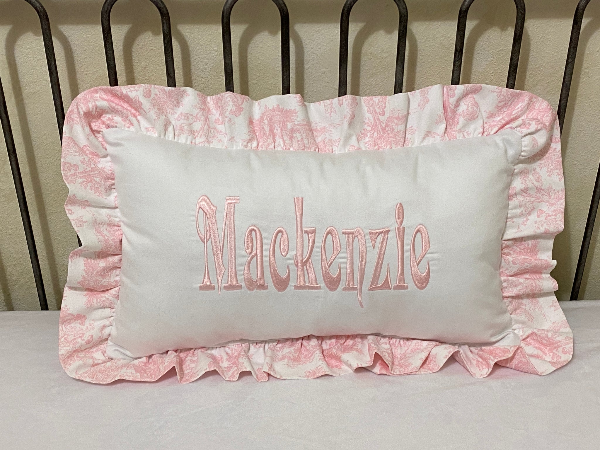 Accent pillow in a white cotton fabric with toile ruffle. Shown with pink toile; choose the color you would like from the option menu. (Natural toile pillow is made with...