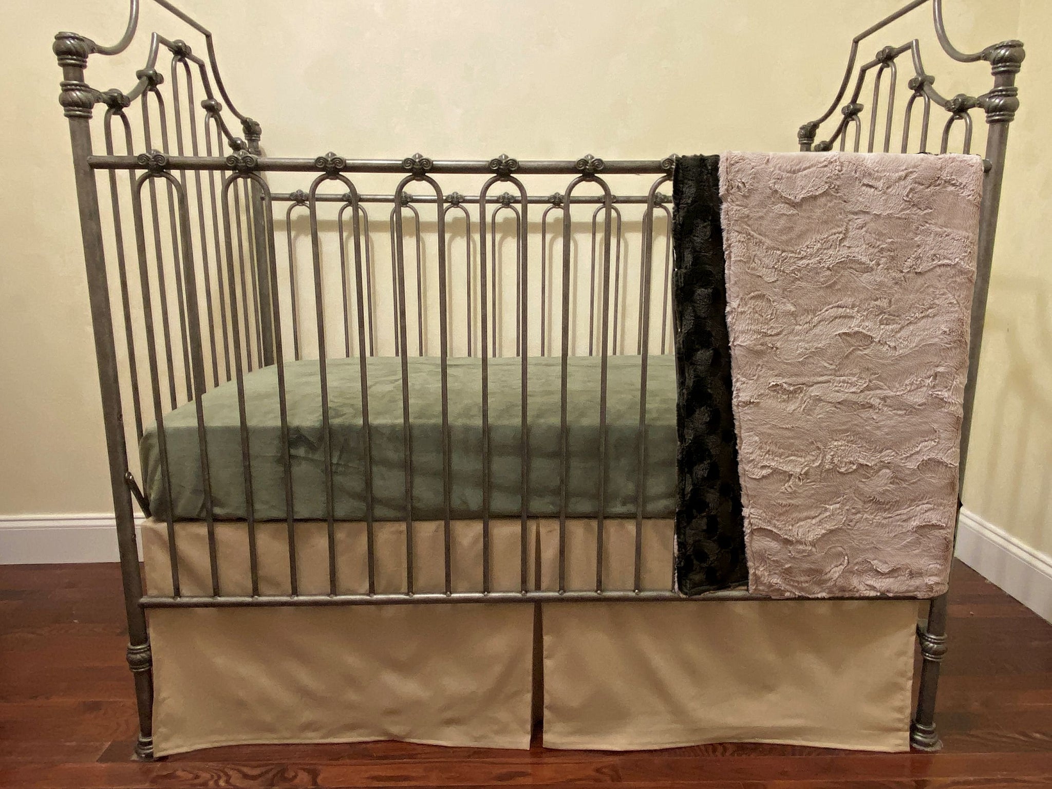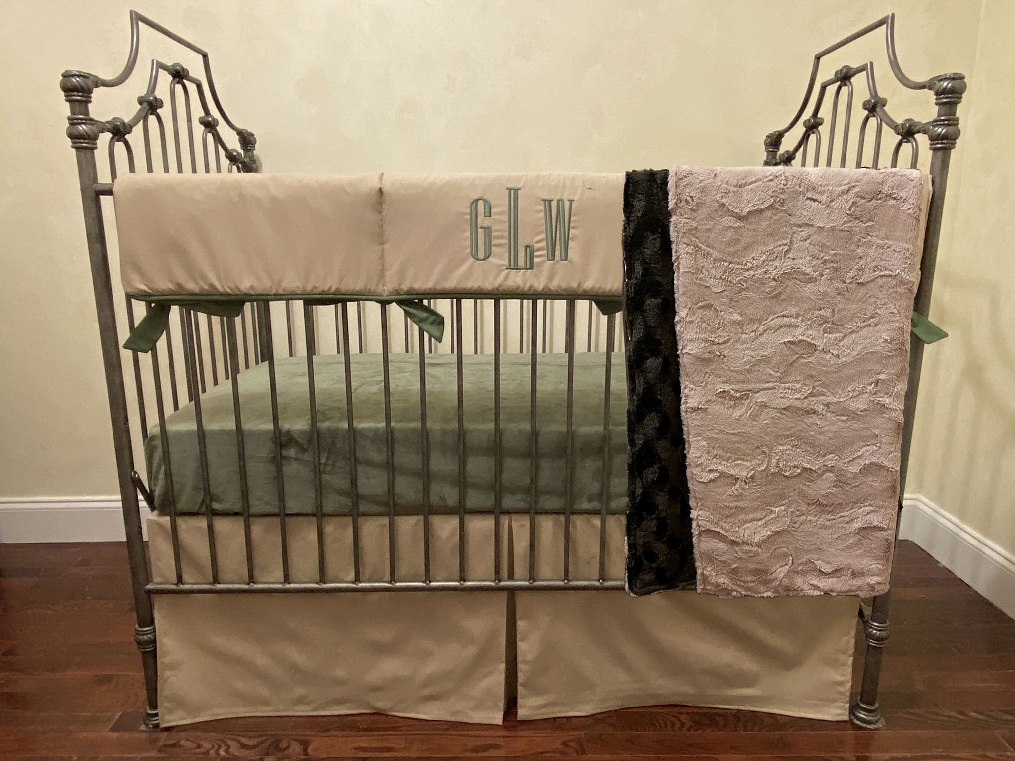 Baby boy crib bedding in a solid latte/tan color with forest green accents. Choose the pieces you would like from the options menu. All pieces are made to order - please allow 4 weeks production time.