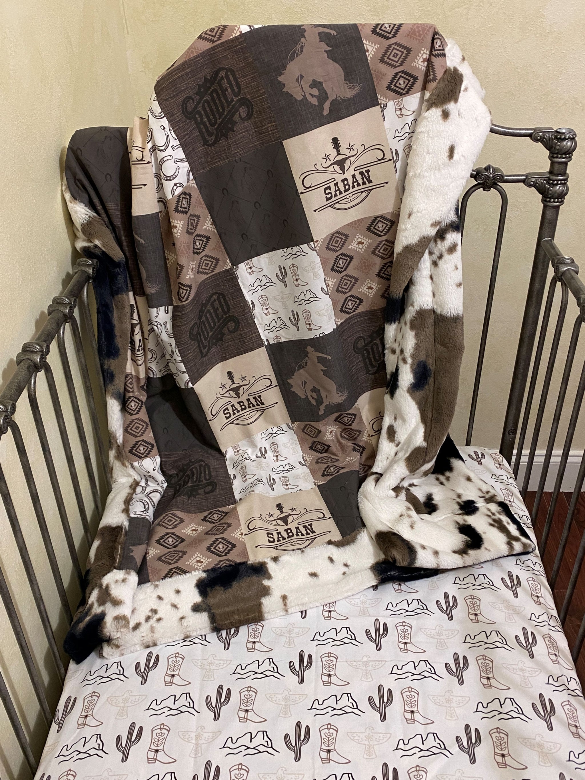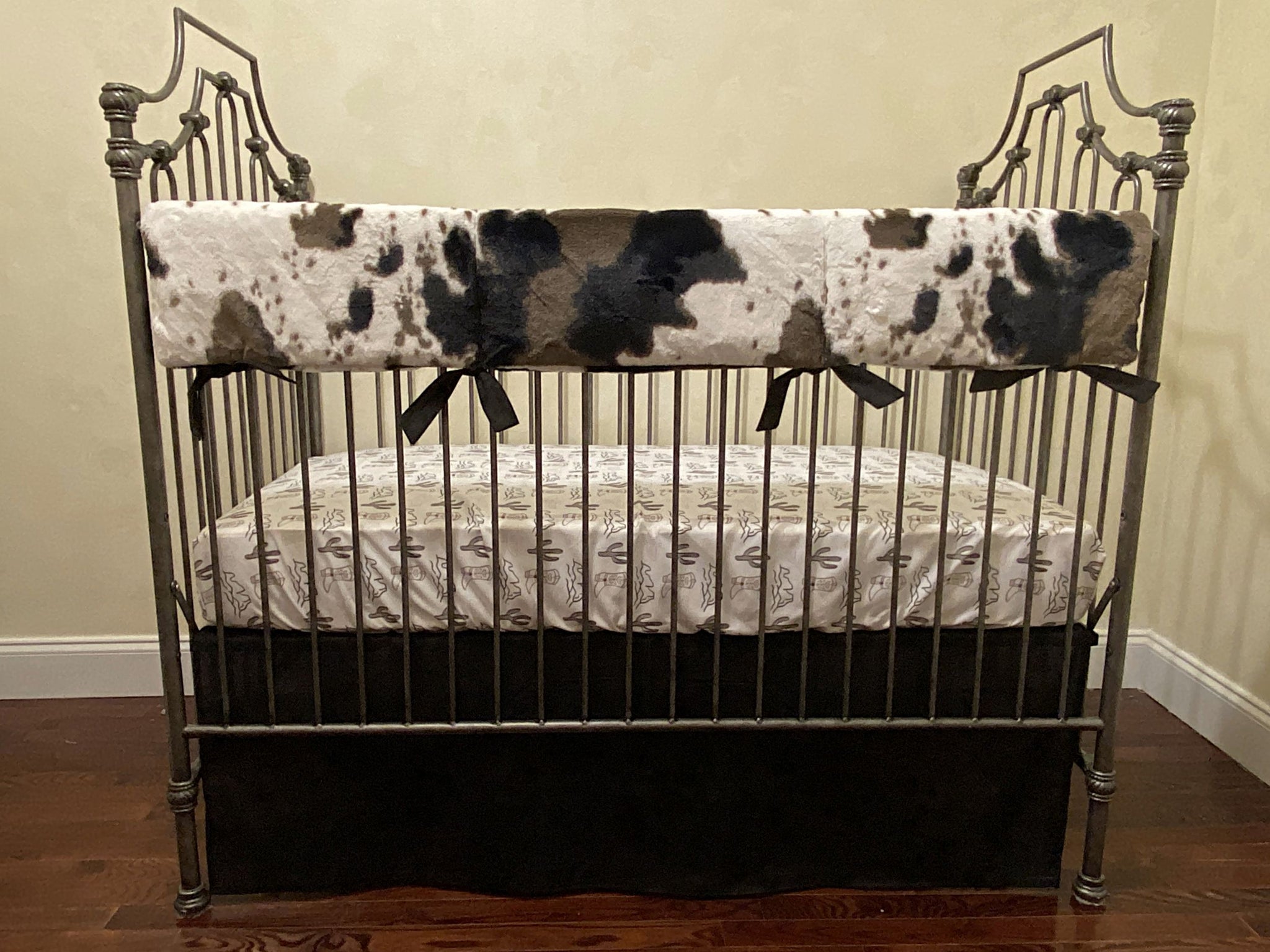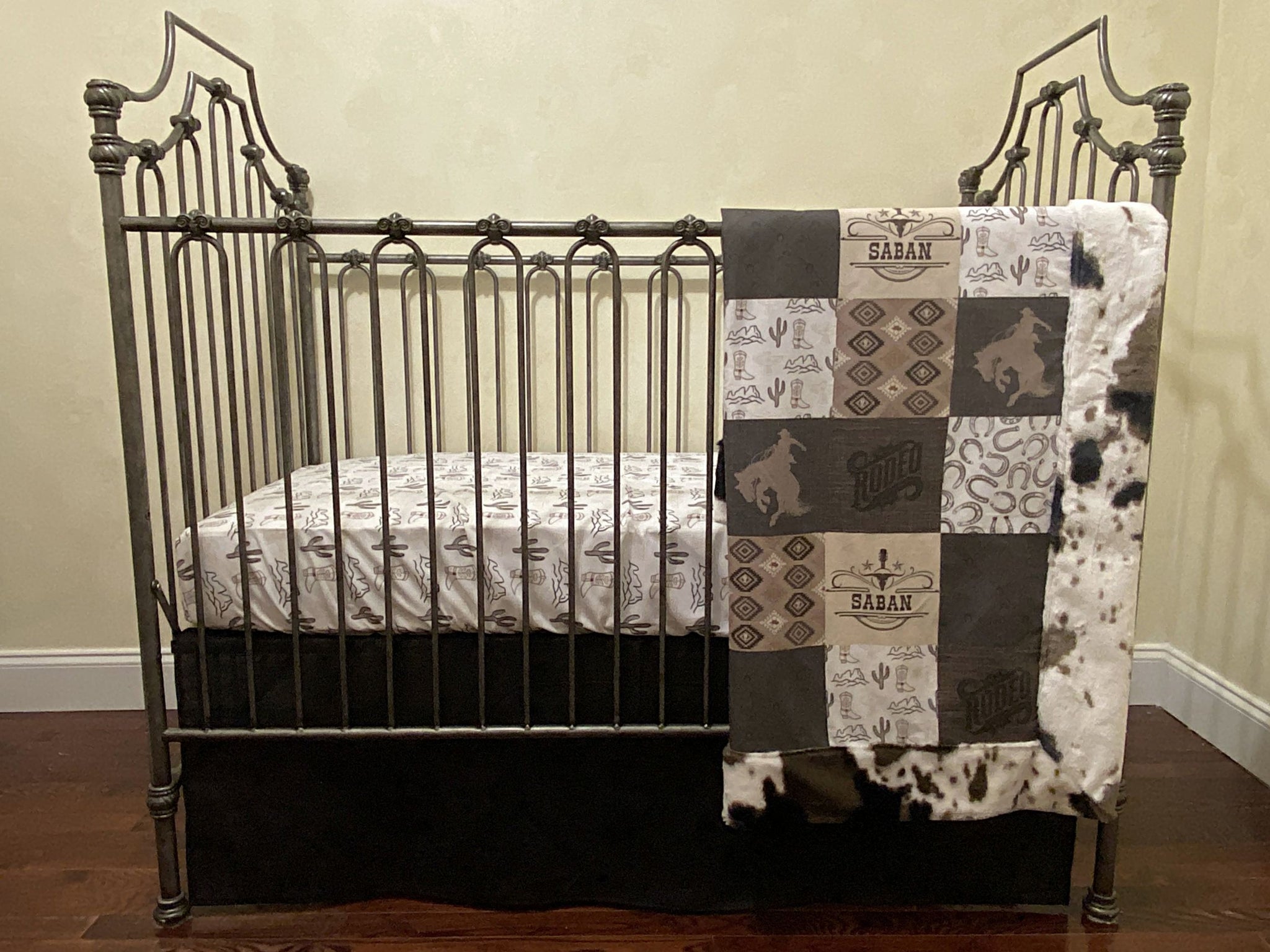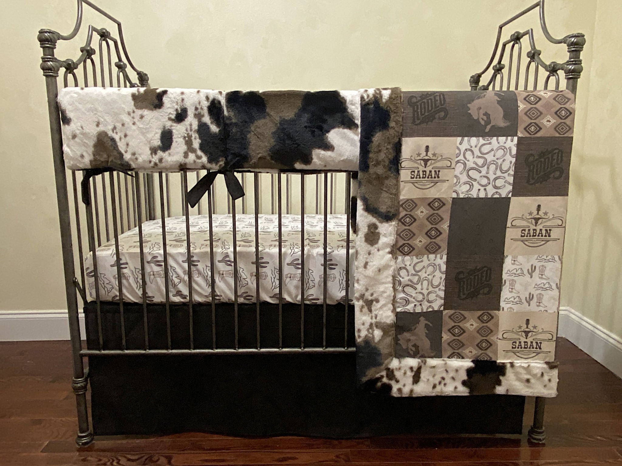 Baby boy crib bedding featuring a brown, black, and white pony/cow hide minky fabric and personalized baby blanket. Choose the pieces you would like from the options menu. All pieces are made to order - please allow 4 weeks production time.