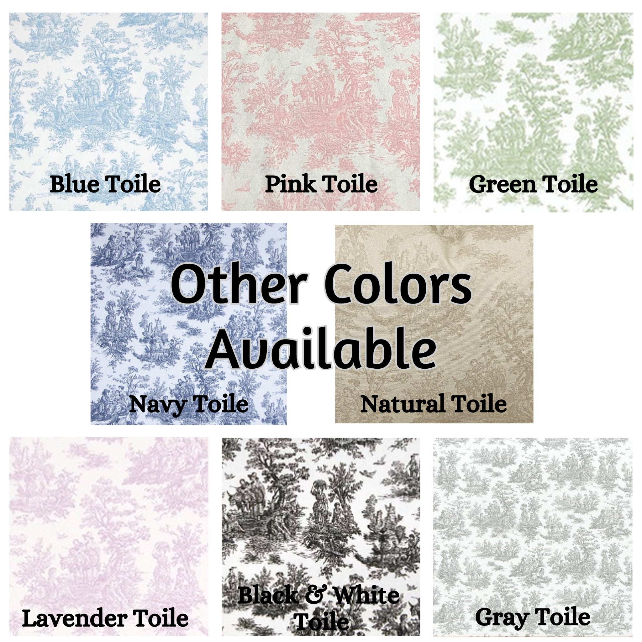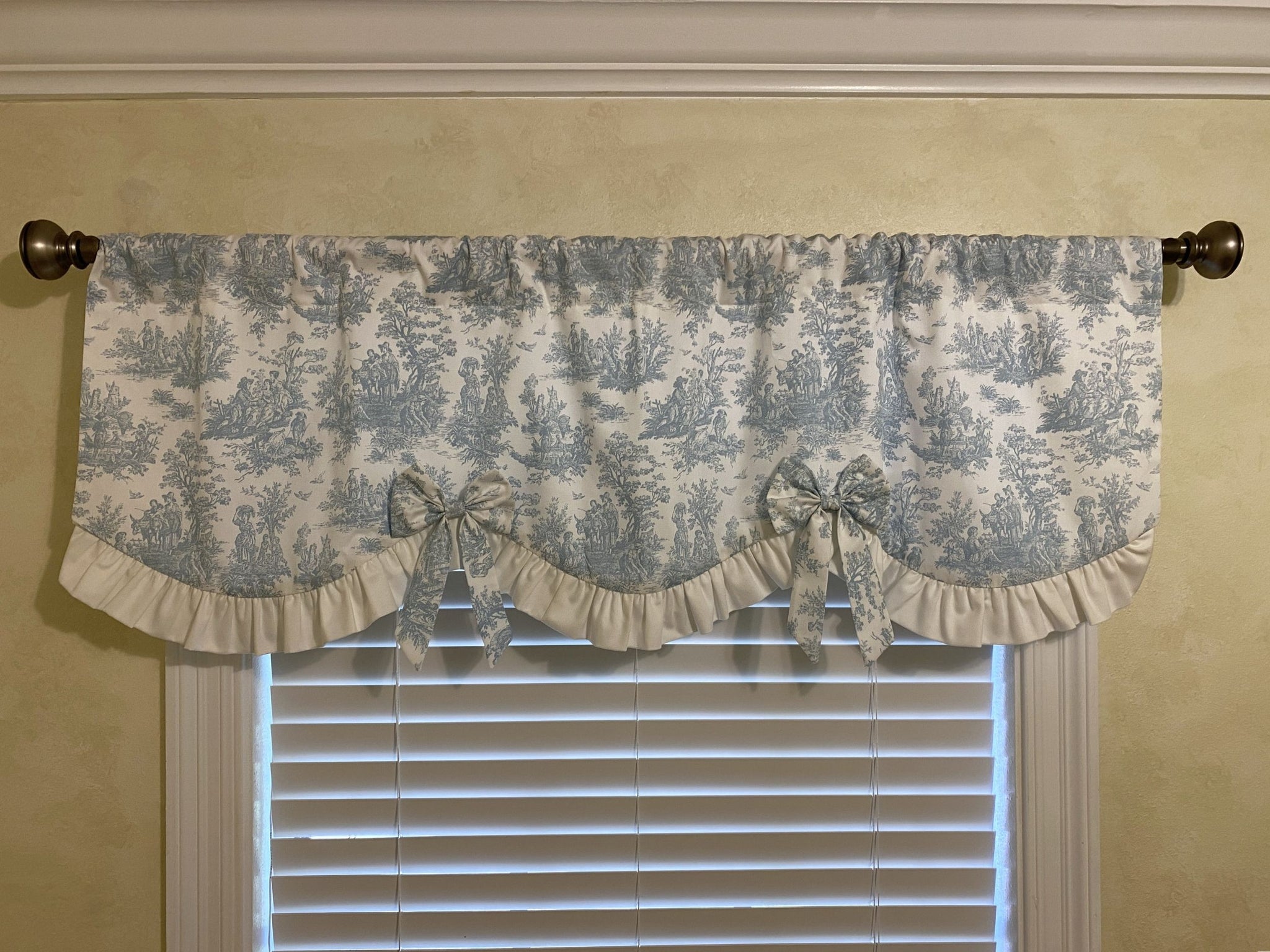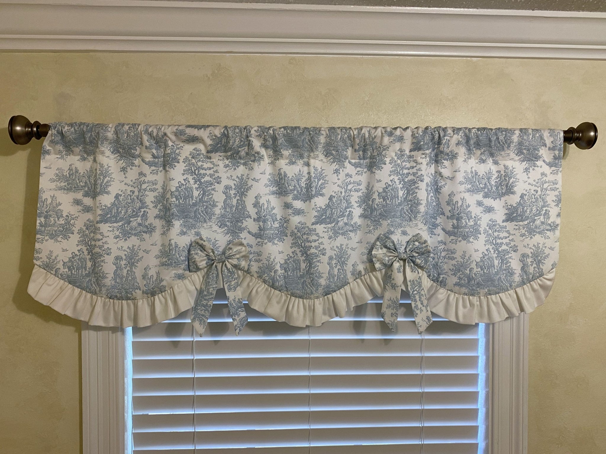 Scalloped window valance in a toile cotton fabric with white ruffle (natural toile will have ivory ruffle.) Choose the color you would like from the drop down menu. Available in...