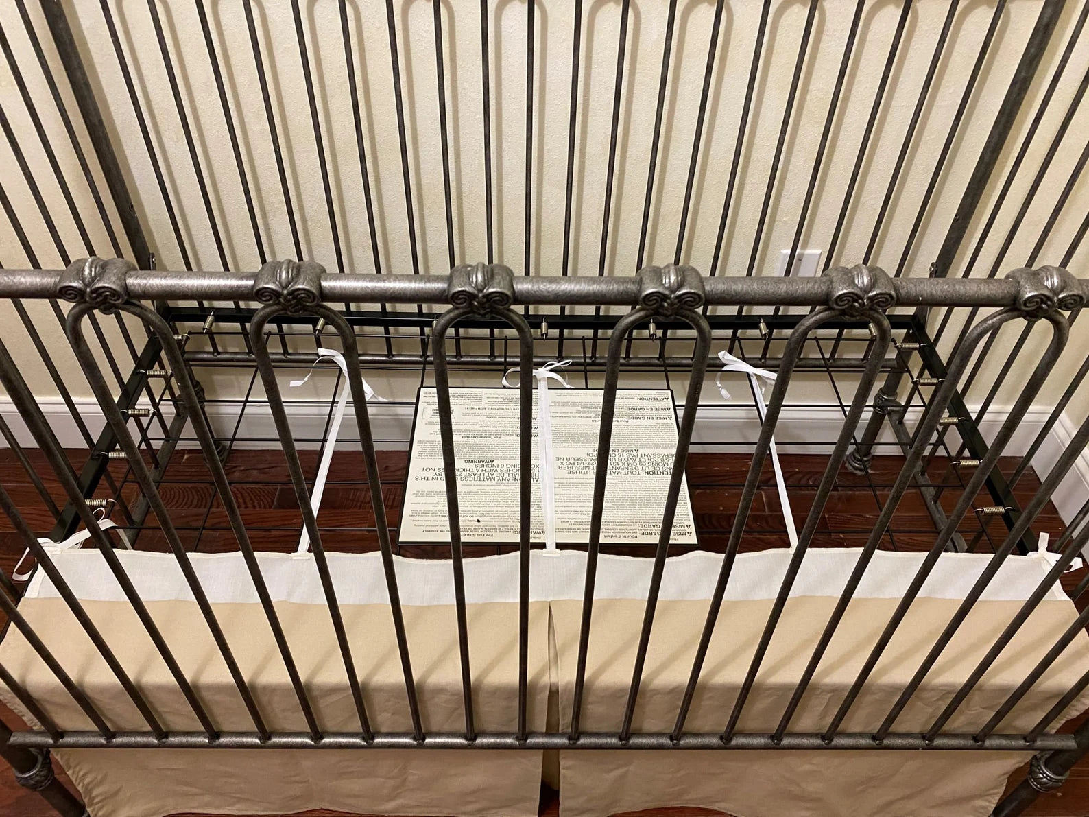 Custom add-on to make your crib skirt adjustable. Skirt will be made in separate pieces with ribbon ties that tie to the mattress deck, allowing you to adjust the length...
