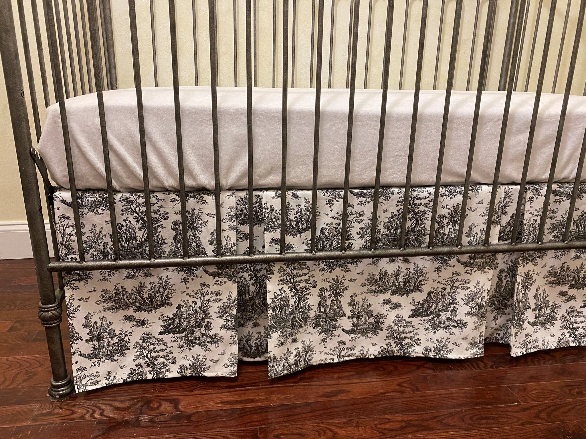 Scalloped edge crib skirt in a colonial toile cotton fabric. Choose pink, blue, or gray toile fabric. Crib skirt can be made with 3 sides (front long and two short...
