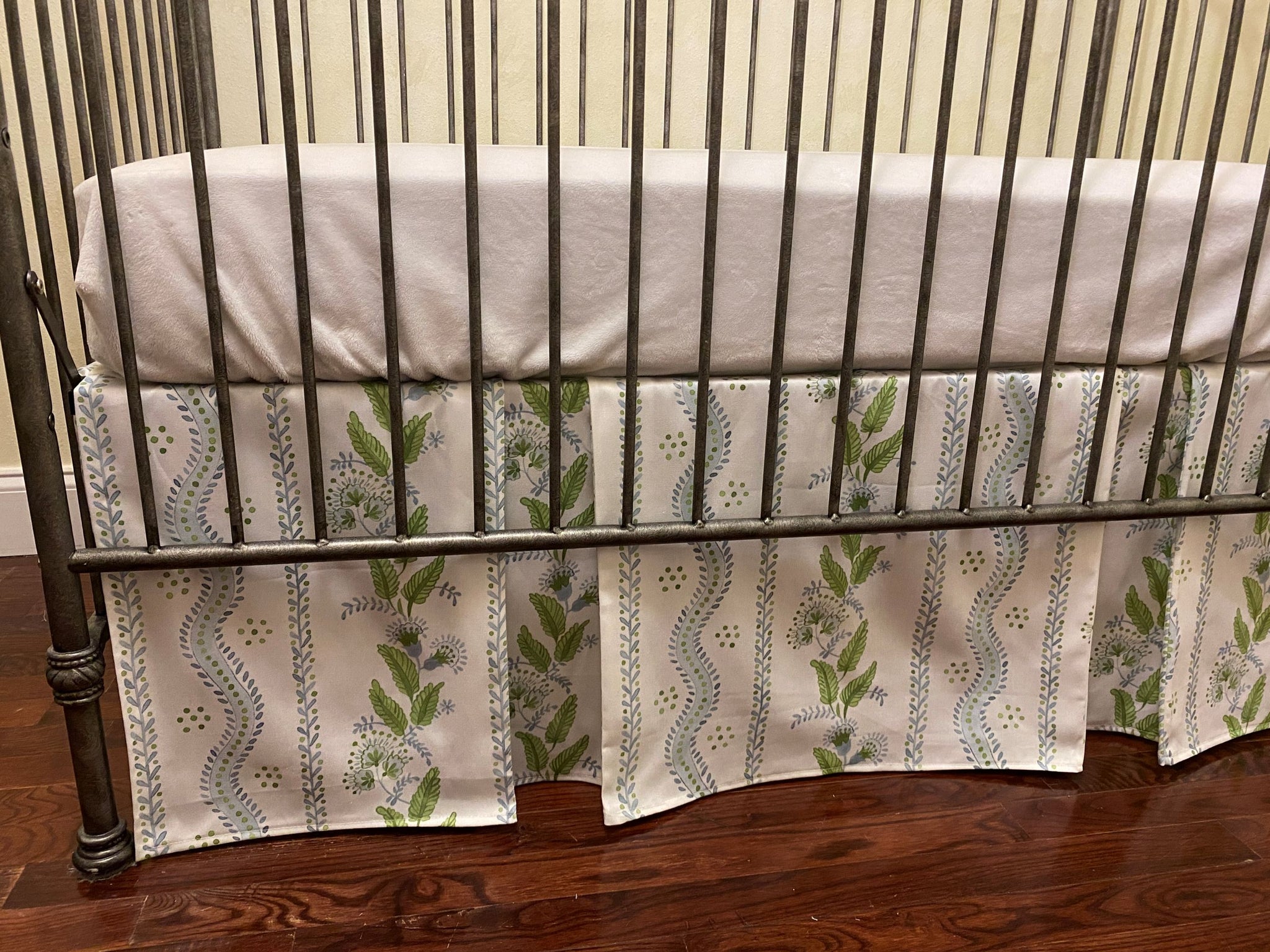 Tailored, Pleated Crib Skirt in Stripes and Vines Designer Fabric - Choose Your Color